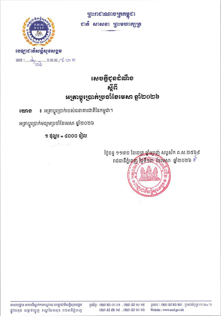 ភ្នំពេញ៖ នារសៀលថ្ងៃសុក្រ ទី១៧ ខែមេសា ឆ្នាំ២០២៦ នេះ ឯកឧត្តមបណ្ឌិត ហេង សុផាន់ណារិទ្ធ អគ្គនាយករង ប.ស.ស. តំណាង ឯកឧត្តម ម៉េង ហុង ប្រតិភូរាជរដ្ឋាភិបាលទទួលបន្ទុកជាអគ្គនាយកបេឡាជាតិសន្តិសុខសង្គម នៃក្រសួងការងារ និងបណ្តុះបណ្តាលវិជ្ជាជីវៈ បាន ...