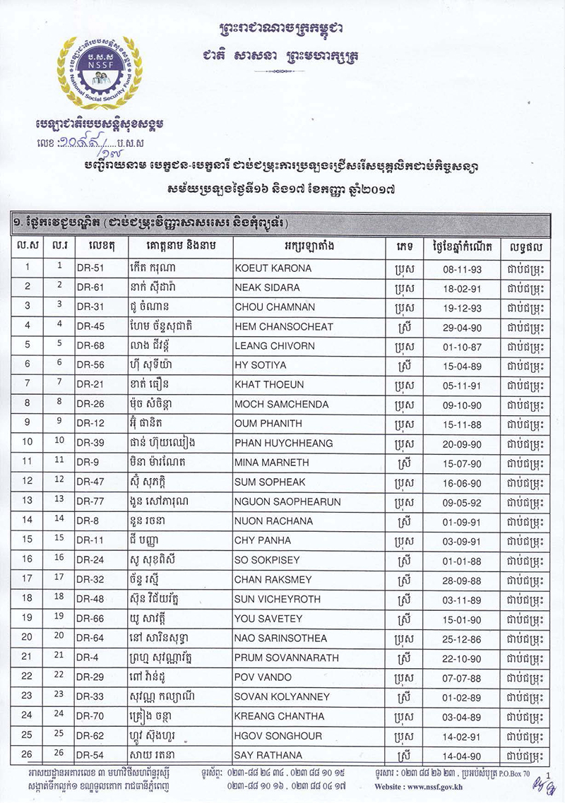 ← បញ្ជីរាយនាម បេក្ខជន-បេក្ខនារី ជាប់ជម្រុះការប្រឡងជ្រើសរើសបុគ្គលិកជាប់កិច្ចសន្យា នាសម័យប្រលងថ្ងៃទី ១៦-១៧ ខែកញ្ញា ឆ្នាំ២០១៧