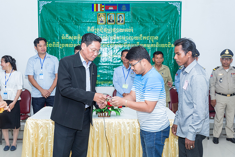 ← ឯកឧត្តម អ៊ុក សមវិទ្យា ប្រតិភូរាជរដ្ឋាភិបាលទទួលបន្ទុកជានាយកបេឡាជាតិរបបសន្តិសុខសង្គម នៅក្នុងពិធីចែកបណ្ណបើកបរ ជូនអ្នកបើកបរយានយន្ដដឹកកម្មករនិយោជិតនៅរោងចក្រ SABRINA (CAMBODIA) GARMENT MANUFACTURING CORP ខេត្តកំពង់ស្ពឺ