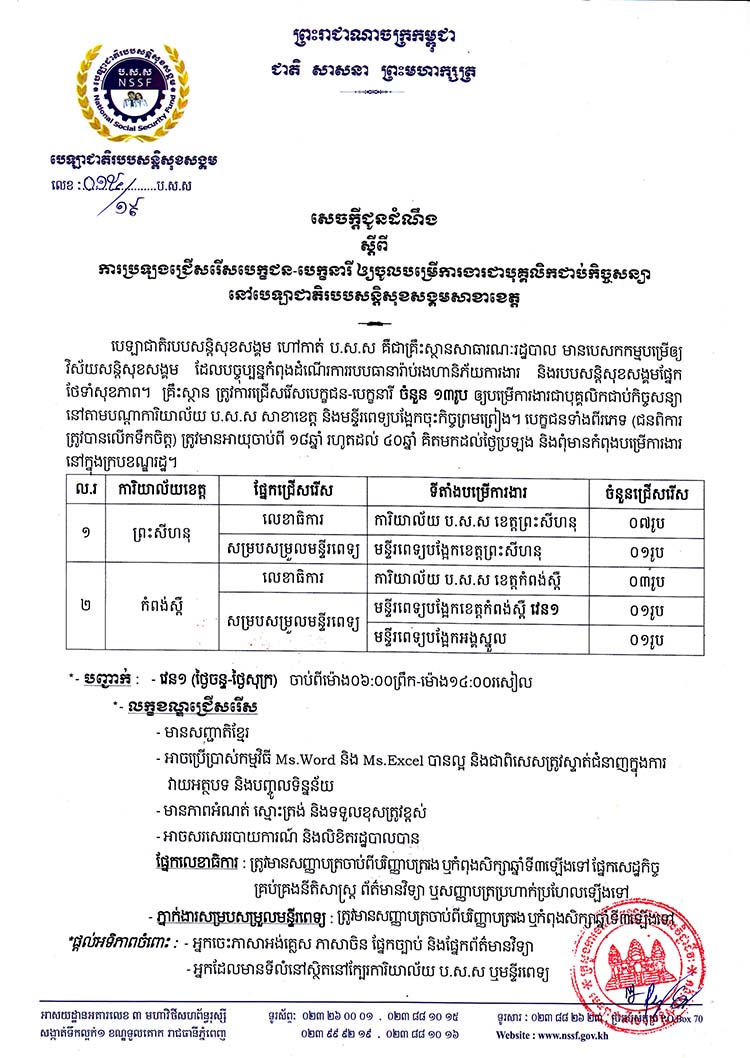 ← សេចក្ដីជូនដំណឹង ស្ដីពីការប្រឡងជ្រើសរើសបេក្ខជន-បេក្ខនារី ឲ្យចូលបម្រើការងារជាបុគ្គលិកជាប់កិច្ចសន្យា នៅបេឡាជាតិរបបសន្តិសុខសង្គមសាខាខេត្តព្រះសីហនុ និងកំពង់ស្ពឺ