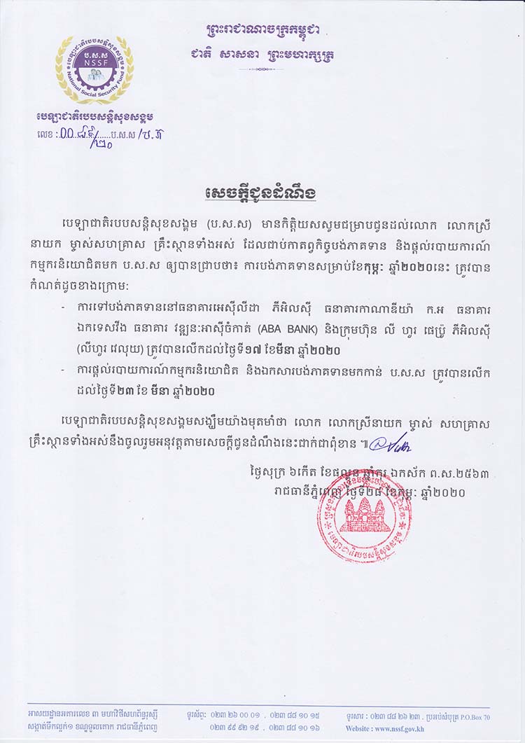 សេចក្ដីជូនដំណឹងស្ដីពីការលើកថ្ងៃបង់ភាគទានក្នុងខែមីនា