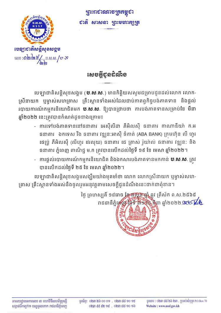 សេចក្ដីជូនដំណឹងស្ដីពីការលើកថ្ងៃបង់ភាគទានក្នុងខែមេសា