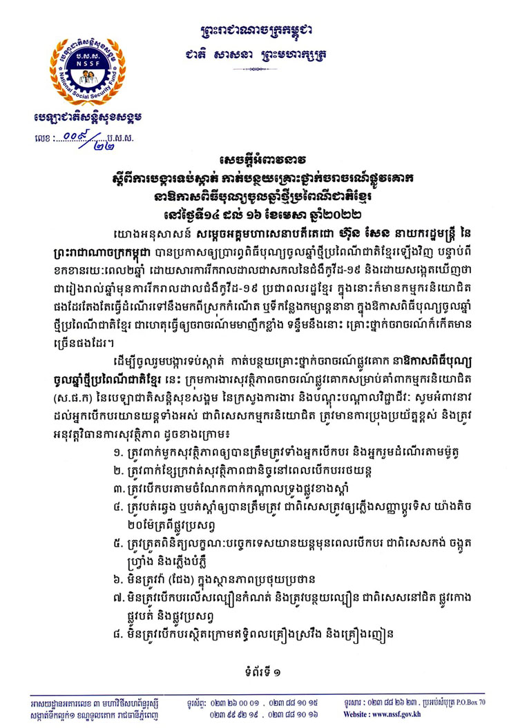 ← សេចក្តីអំពាវនាវ ស្តីពីវិធានការបង្ការទប់ស្កាត់ និងកាត់បន្ថយគ្រោះថ្នាក់ចរាចរណ៍ផ្លូវគោក នាឱកាសពិធីបុណ្យចូលឆ្នាំប្រពៃណីជាតិខ្មែរ