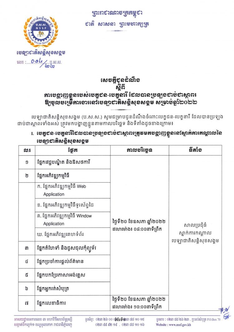 ← សេចក្ដីជូនដំណឹងស្ដីពីការបង្ហាញខ្លួនរបស់បេក្ខជន-បេក្ខនារី ដែលបានប្រឡងជាប់ជាស្ថាពរឲ្យចូលបម្រើការងារនៅបេឡាជាតិសន្តិសុខសង្គមសម្រាប់ឆ្នាំ២០២២