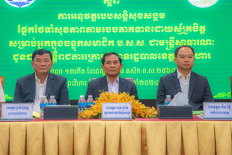 ខេត្តព្រះវិហារ៖ នាព្រឹកថ្ងៃទី១៩ ខែមិថុនា ឆ្នាំ២០២៤ ឯកឧត្តម អេត បូរ៉ាត់ អគ្គនាយករង ប.ស.ស. តំណាង ឯកឧត្តម ម៉េង ហុង ប្រតិភូរាជរដ្ឋាភិបាលទទួលបន្ទុកជាអគ្គនាយក ប.ស.ស. នៃក្រសួងការងារ និងបណ្ដុះបណ្ដាលវិជ្ជាជីវៈ បានអញ្ជើញជាសហធិបតី ក្នុងកម្មវិធីបើកពិធីផ្សព្វផ្សាយស្តីពី “ការអនុវត្តរបបសន្តិសុខសង្គមផ្នែកថែទាំសុខភាពតាមរបបភាគទានដោយស្ម័គ្រចិត្តសម្រាប់អ្នកក្នុងបន្ទុកសមាជិក ប.ស.ស. ជាមន្ត្រីសាធារណៈ” ជូនដល់ថ្នាក់ដឹកនាំ និងមន្ត្រីរាជការក្រោមឱវាទរដ្ឋបាលខេត្តព្រះវិហារ ដោយមានអ្នកចូលរួមប្រមាណជាង ៣០០នាក់។