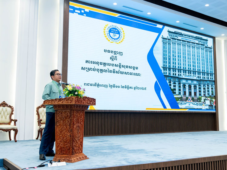 (ភ្នំពេញ)៖ នាព្រឹកថ្ងៃទី១១ ខែវិច្ឆិកា ឆ្នាំ២០២៥នេះ ឯកឧត្តមបណ្ឌិត ហេង សុផាន់ណារិទ្ធ អគ្គនាយករង ប.ស.ស. តំណាង ឯកឧត្តម ម៉េង ហុង ប្រតិភូរាជរដ្ឋាភិបាលទទួលបន្ទុកជាអគ្គនាយក ប.ស.ស. នៃក្រសួងការងារ និងបណ្តុះបណ្តាលវិជ្ជាជីវៈ បានអញ្ជើញជាអធិបតី បើកពិធីផ្សព្វផ្សាយស្ដីពី “ការអនុវត្តរបបសន្ដិសុខសង្គមសម្រាប់បុគ្គលដែលស្ថិតក្នុងវិស័យសាធារណៈ ជូនដល់មន្ត្រីទទួលបន្ទុកការងារ ប.ស.ស. ប្រចាំក្រសួង ស្ថាប័ន និងអង្គភាព” សរុបជាង២០០រូប នៅទីស្នាក់ការកណ្តាល ប.ស.ស. រាជធានីភ្នំពេញ។