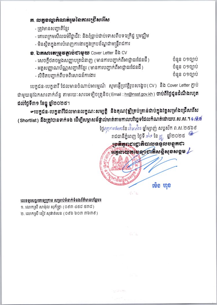 សេចក្តីជូនដំណឹងស្តីពីការជ្រើសរើសអ្នកជំនាញការ_Page_2 ចេញផ្សាយ៖ ថ្ងៃ សៅរ៍ ទី ១៣ ខែ ធ្នូ ឆ្នាំ ២០២៥ | ដោយ៖ NSSF Full size is 750 × 1054 pixels 1_ជ្រើសរើសអ្នកជំនាញការ_Page_2 » « សេចក្តីជូនដំណឹងស្តីពីការជ្រើសរើសអ្នកជំនាញការ_Page_1