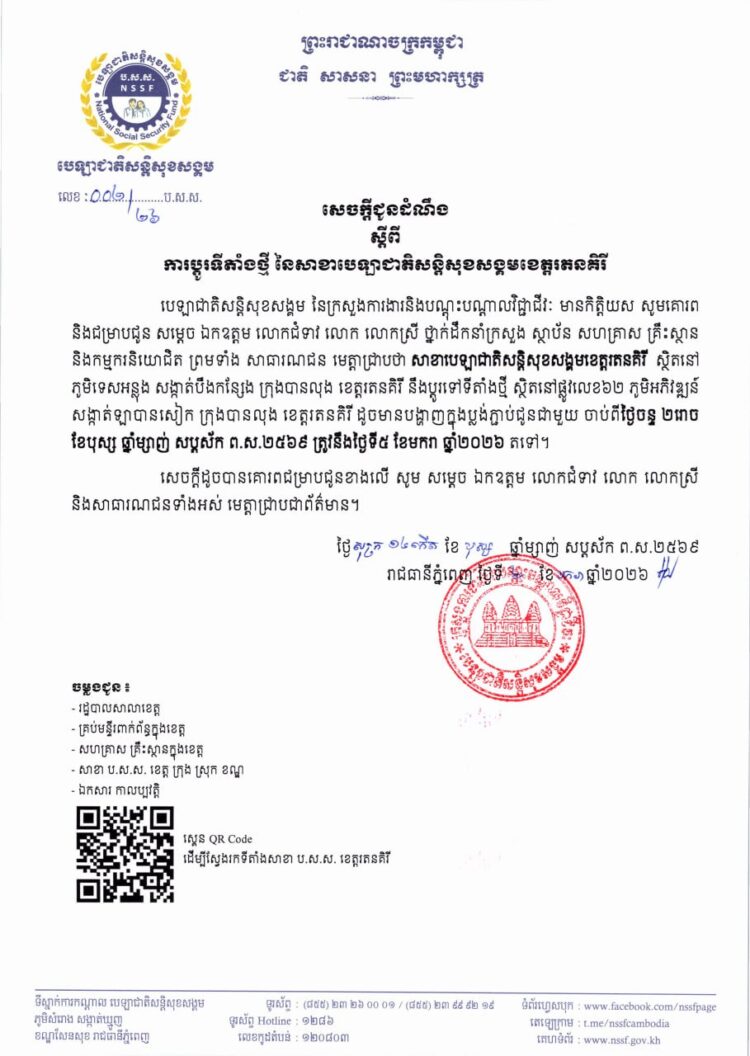• សេចក្ដីជូនដំណឹងស្ដីពី ការប្ដូរទីតាំងថ្មី នៃសាខាបេឡាជាតិសន្តិសុខសង្គមខេត្តរតនគិរី