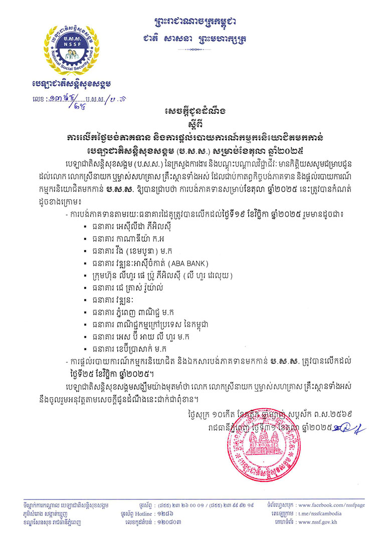 ភ្នំពេញ៖ នាព្រឹកថ្ងៃទី១៣ ខែតុលា ឆ្នាំ២០២៥ នេះ ថ្នាក់ដឹកនាំបេឡាជាតិសន្តិសុខសង្គម (ប.ស.ស.) នៃក្រសួងការងារ និងបណ្ដុះបណ្ដាលវិជ្ជាជីវៈ បានអញ្ជើញចូលរួមក្នុងសិក្ខាសាលាស្ដីពី ”ការបូកសរុបរបាយការណ៍វឌ្ឍនភាពនៃការតាមដាន និងត្រួតពិនិត្យការអនុវត្ត ...
